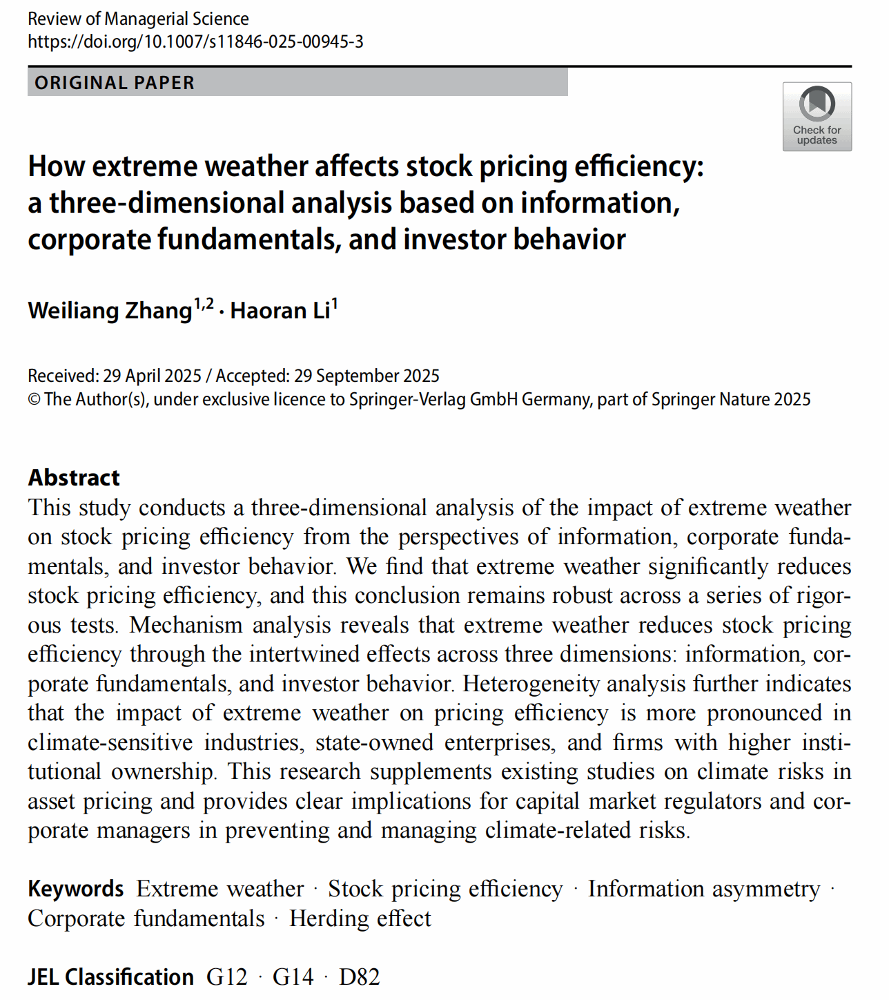 引用方式:Zhang, W., Li, H. How extreme weather affects stock pricing efficiency: a three-dimensional analysis based on information, corporate fundamentals, and investor behavior. Rev Manag Sci (2025). //doi.org/10.1007/s11846-025-00945-3