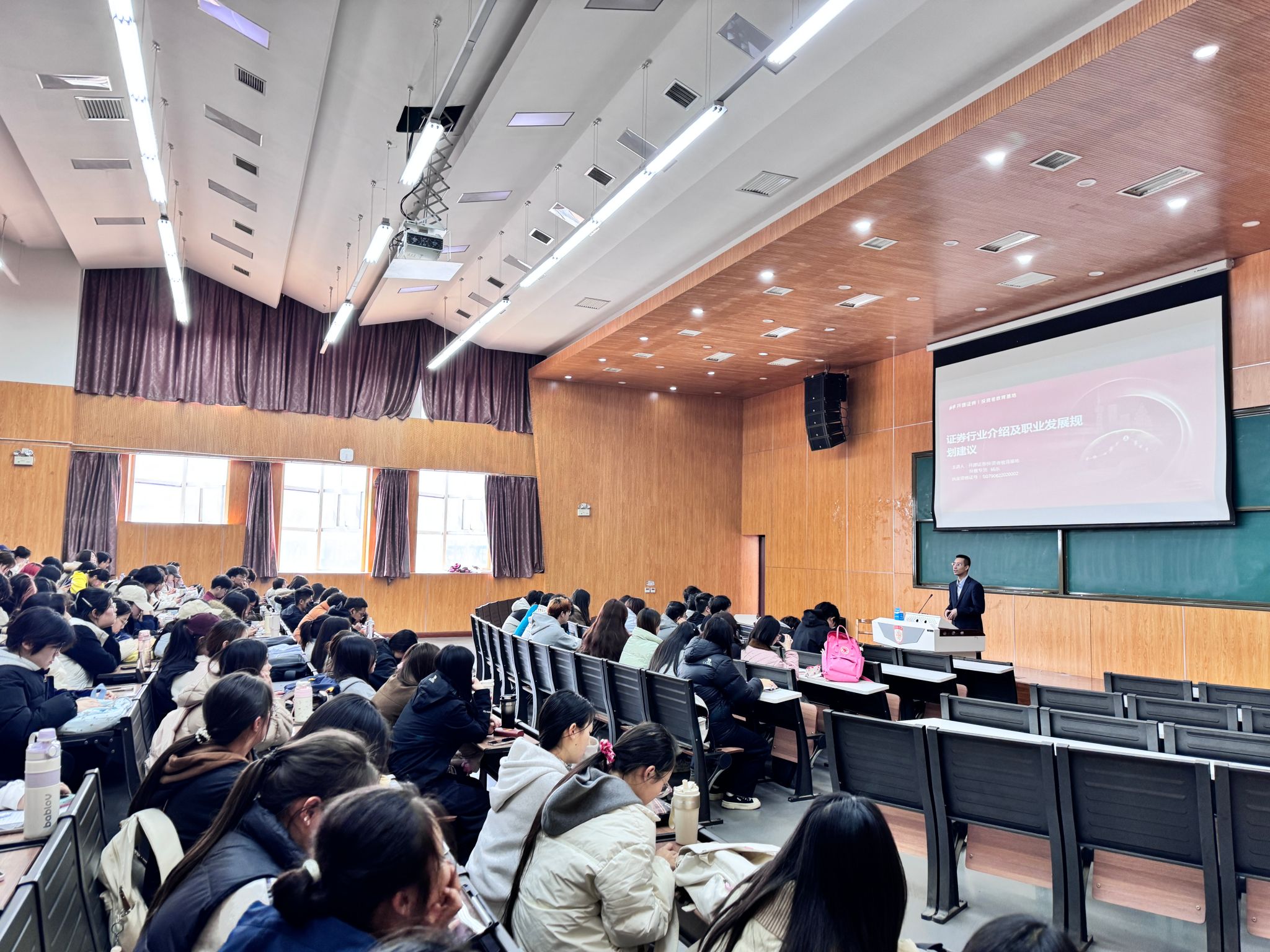 讲座现场,主讲人凭借深厚的行业积淀与丰富的实战经验,以生动简洁的语言风格,抽丝剥茧地剖析了当前证券行业的宏观格局与发展趋势。从投行、研报到资产管理等核心岗位的能力素质模型,再到具体的职业晋升路径,讲师进行了全方位、多维度的深度解读。其授课内容既有理论高度,又极具实操指导意义,巧妙地将枯燥的行业数据转化为鲜活的职场案例,引发了在场同学们的强烈共鸣。
