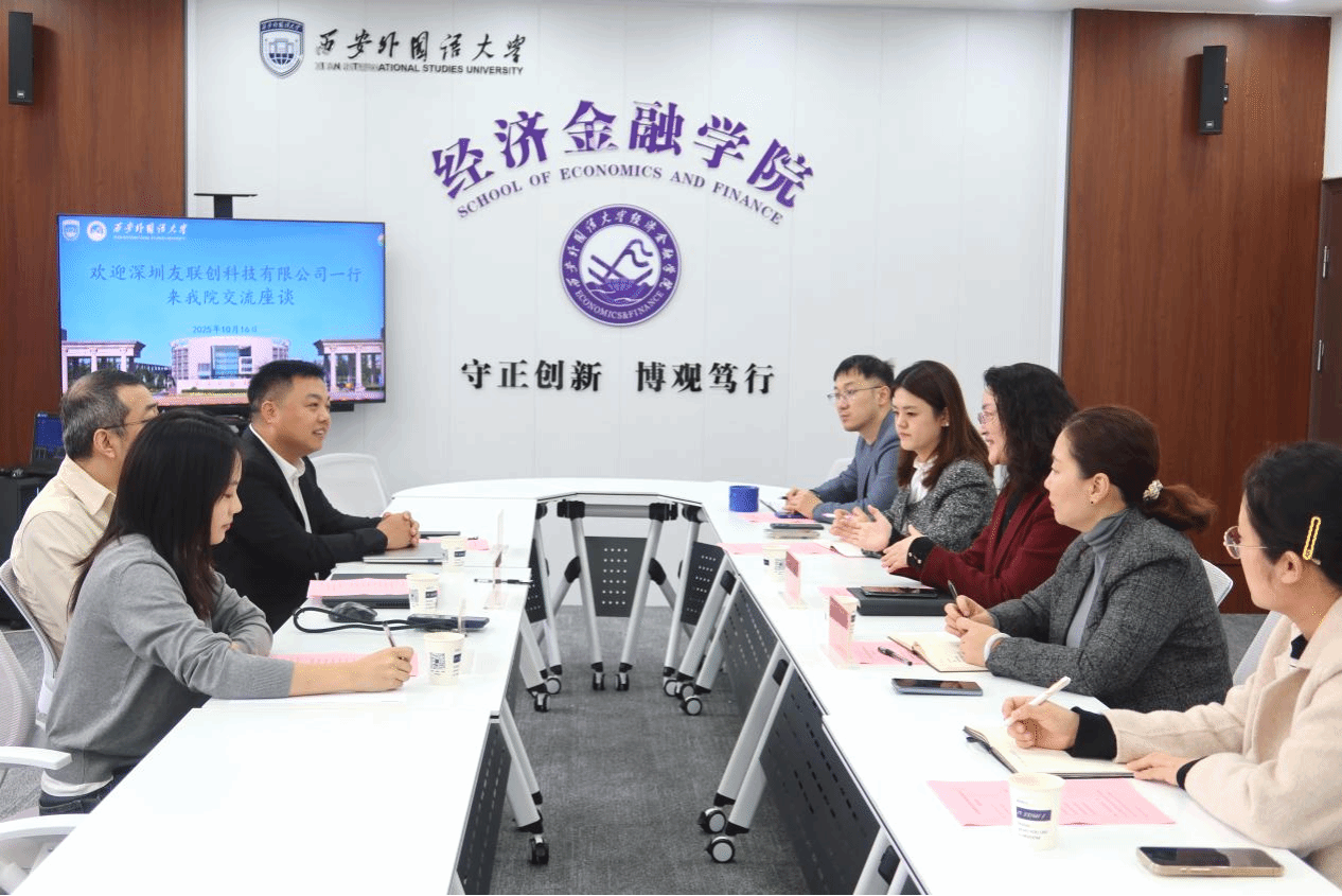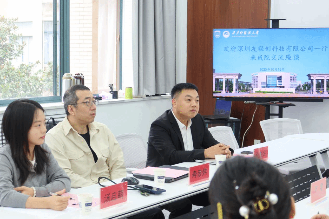 10月16日下午,黑丝做爱 与深圳市友联创科技有限公司在教学楼E303会议室举行校企座谈交流。深圳市友联创科技有限公司董事长寿彦炜、副总经理钱由兴、HR汤启萌,黑丝做爱 党委书记邓雯、党委副书记尚瑞及2022级辅导员王瑾、梁静、研究生辅导员张亮参加座谈。