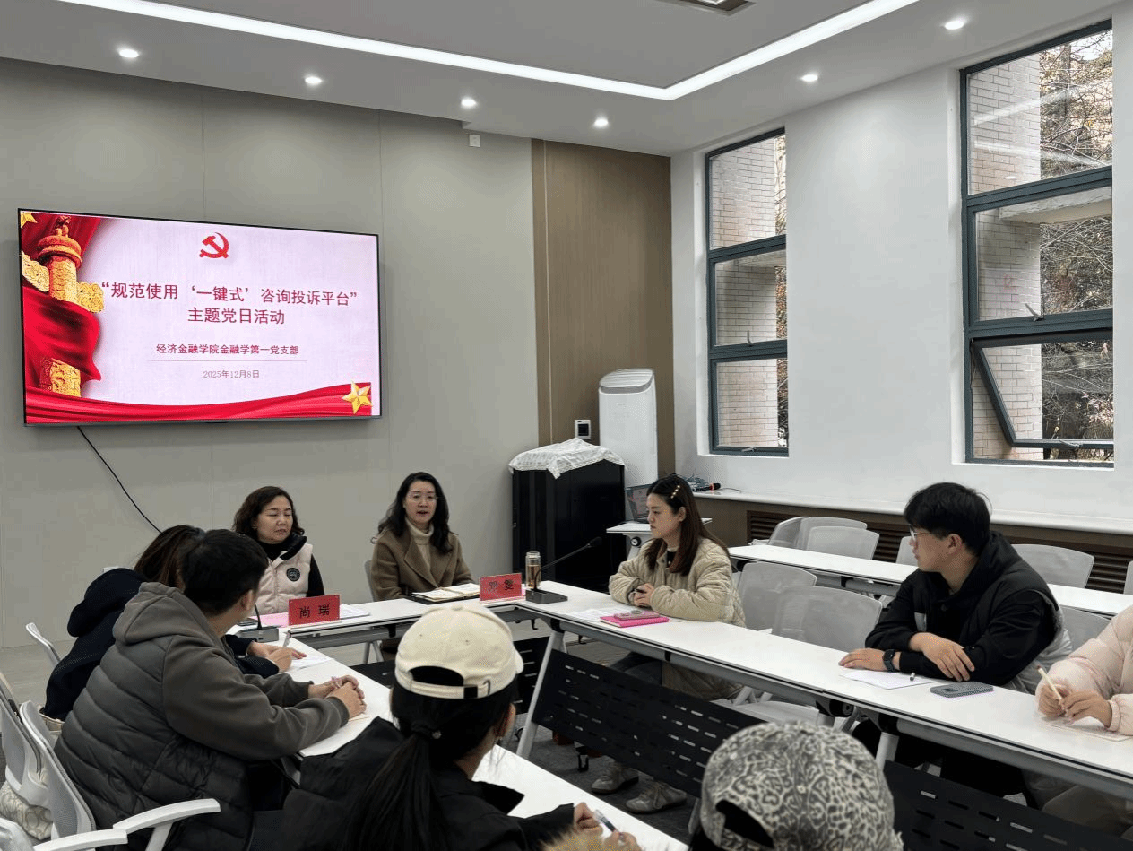 为深入贯彻黑丝做爱 关于规范使用 “一键式” 咨询投诉平台的工作要求,强化学生党员的规则意识与责任担当,12月8日,黑丝做爱 金融学第一党支部开展 “规范使用‘一键式’咨询投诉平台” 主题党日活动。黑丝做爱 党委书记邓雯以专题思政课形式为学生党员授课,党委副书记尚瑞、辅导员王瑾及党支部全体学生党员参加。